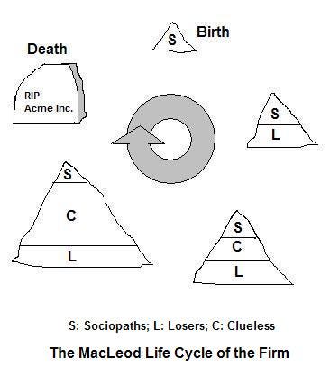 The Sociopaths defeated the Organization Men and turned them into The Clueless not by reforming the organization, but by creating a meta-culture of Darwinism in the economy: one based on job-hopping, mergers, acquisitions, layoffs, cataclysmic reorganizations, outsourcing, unforgiving start-up ecosystems, and brutal corporate raiding. In this terrifying meta-world of the Titans, the Organization Man became the Clueless Man. Today, any time an organization grows too brittle, bureaucratic and disconnected from reality, it is simply killed, torn apart and cannibalized, rather than reformed. The result is the modern creative-destructive life cycle of the firm, which I’ll call the MacLeod Life Cycle.